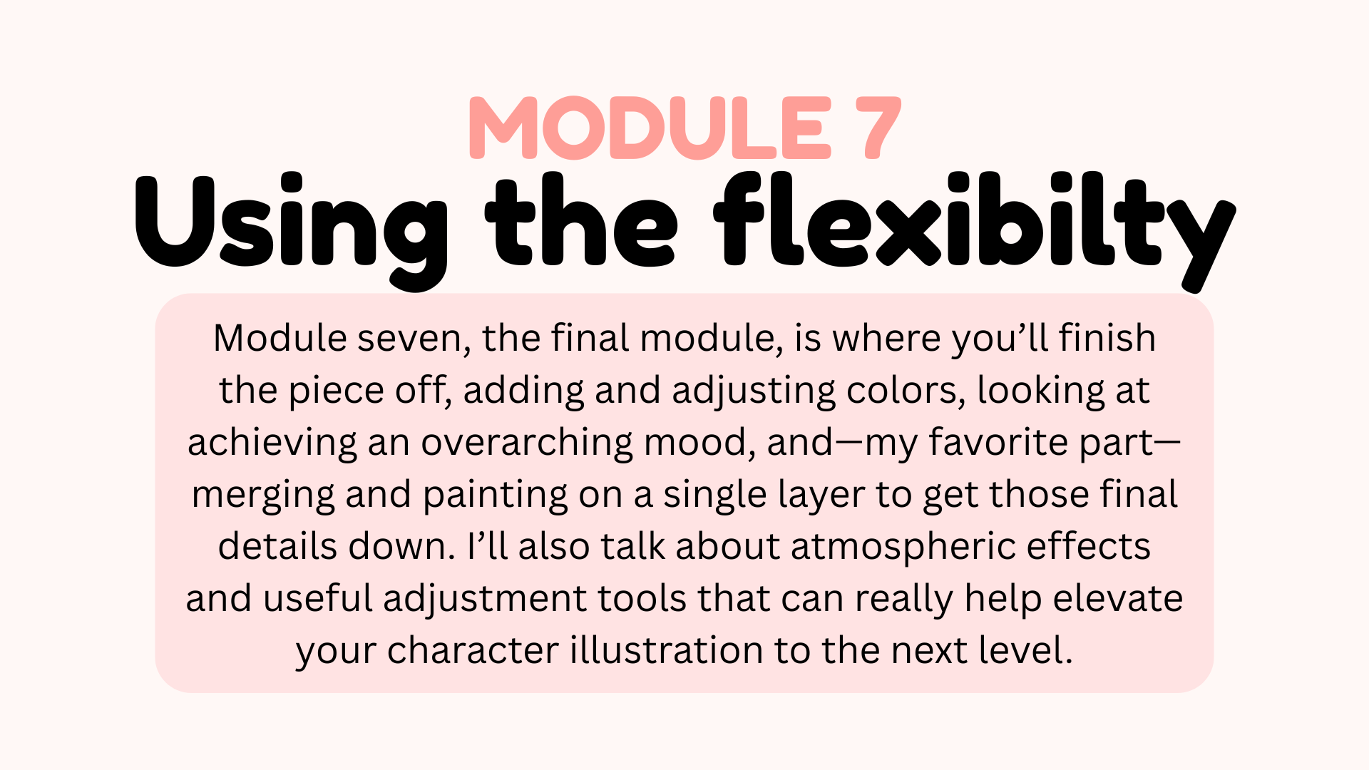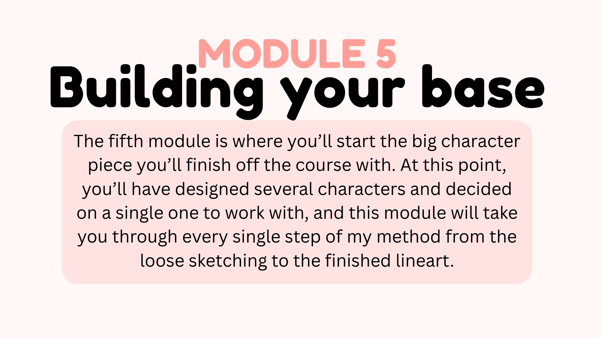 The course has 7 modules for 8+ hours of learning and practicing. You can pause and replay the videos as much as you want, and take the course in your own time. The course is suitable for everyone since there is no explicit content. It is mainly targeted to artists who have the very basics established already, but is beginner-friendly! It would also be best to take the course in order, since lessons will grow more advanced as you progress.