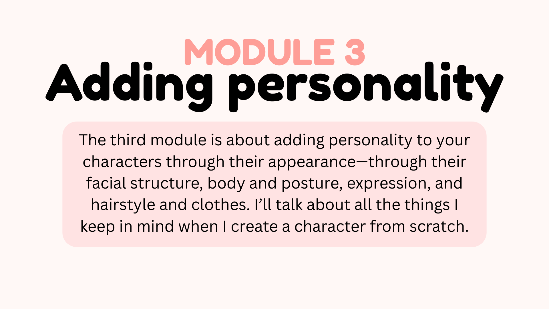 You’ll be able to create your own characters brimming with personality, and you’ll have learnt how to share that personality through expressions, poses, their clothing choices, and lots more.